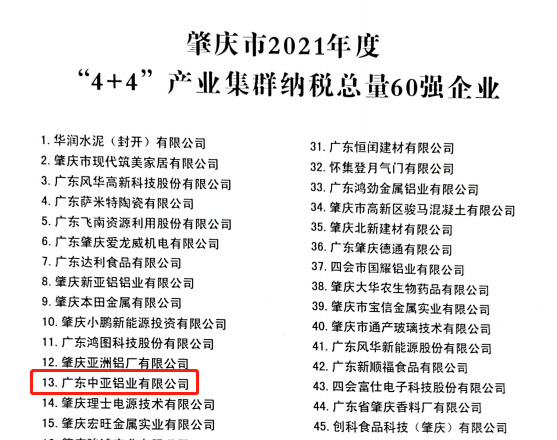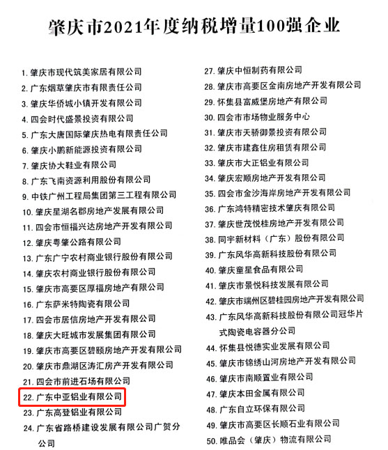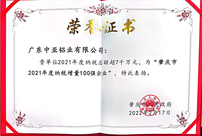 廣東中亞鋁業(yè)獲2021納稅100強(qiáng)企業(yè)榮耀