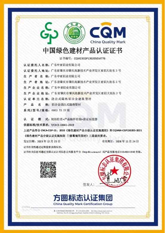廣東中亞鋁材隔熱型材達到中國綠色建材產(chǎn)品三星級要求